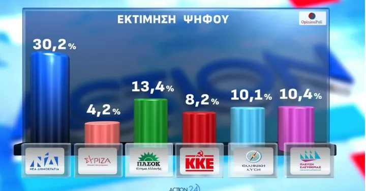 Στην εκτίμηση ψήφου, η ΝΔ συγκεντρώνει το 30,2%, έναντι 13,4% που συγκεντρώνει το δεύτερο ΠΑΣΟΚ.
