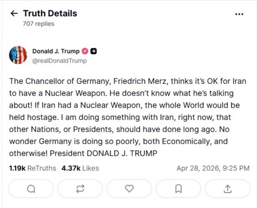 «Ο καγκελάριος της Γερμανίας Φρίντριχ Μερτς νομίζει πως είναι ΟΚ να αποκτήσει πυρηνικά όπλα το Ιράν. Δεν ξέρει τι λέει», έγραψε ο Τραμπ σε ανάρτησή του στην πλατφόρμα Truth Social, διαστρεβλώνοντας τη θέση του Μερτς ο οποίος έχει υπογραμμίσει πως η Τεχεράνη δεν πρέπει να αποκτήσει πυρηνικά όπλα.