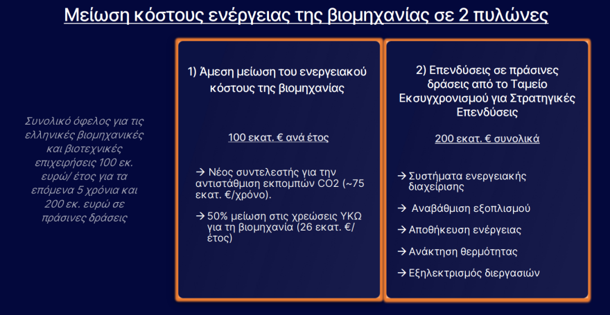 Στο πρώτο σκέλος, το συνολικό όφελος εκτιμάται σε περίπου 100 εκατ. ευρώ ετησίως, με βασικό εργαλείο την αύξηση του συντελεστή αντιστάθμισης εκπομπών CO2 για την περίοδο 2026-2030, που μεταφράζεται σε ενίσχυση της τάξης των 75 εκατ. ευρώ τον χρόνο για τις ενεργοβόρες βιομηχανίες.