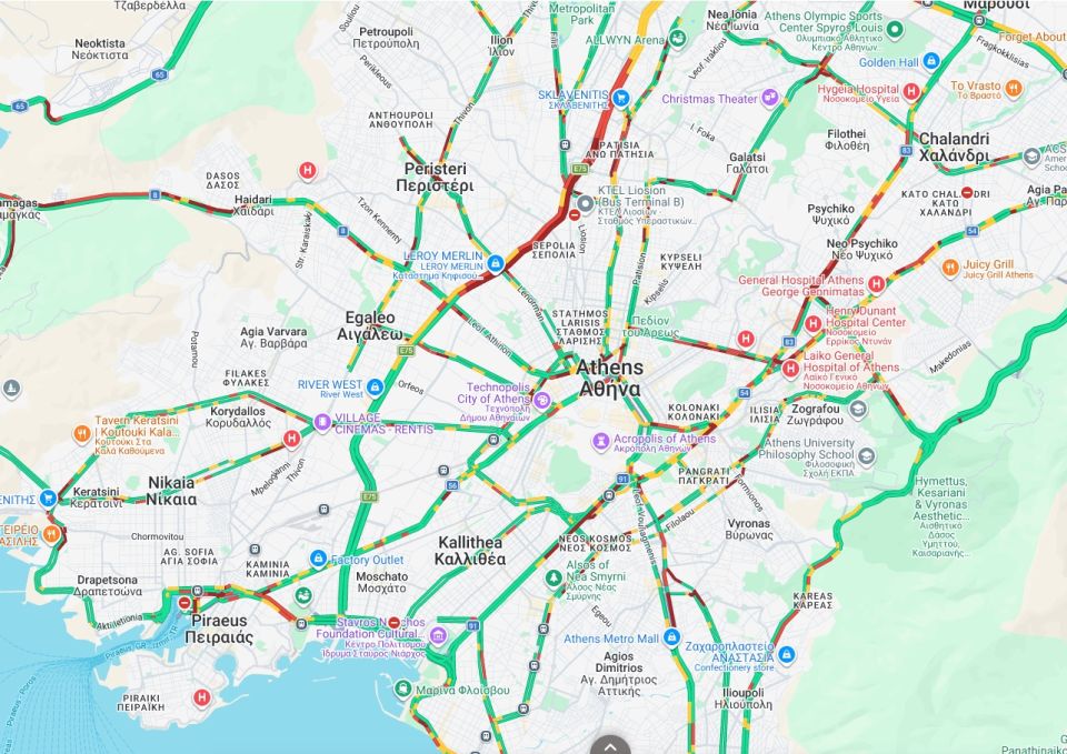 Σε ότι αφορά τους δρόμους του κέντρου, στη Λεωφόρο Κηφισίας η κίνηση είναι αυξημένη, ιδιαίτερα στο ύψος Αμαρουσίου και Χαλανδρίου, χαμηλές ταχύτητες καταγράφονται και στη Μεσογείων, κυρίως κοντά σε βασικούς κόμβους.