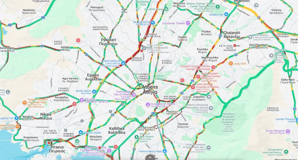 Αναλυτικότερα, στον Κηφισό καταγράφεται πολύ αυξημένη κίνηση κυρίως στο ρεύμα της ανόδου, όπου τα οχήματα κινούνται με πολύ χαμηλές ταχύτητες από το ύψος του Αιγάλεω έως και τη Νέα Ιωνία.
