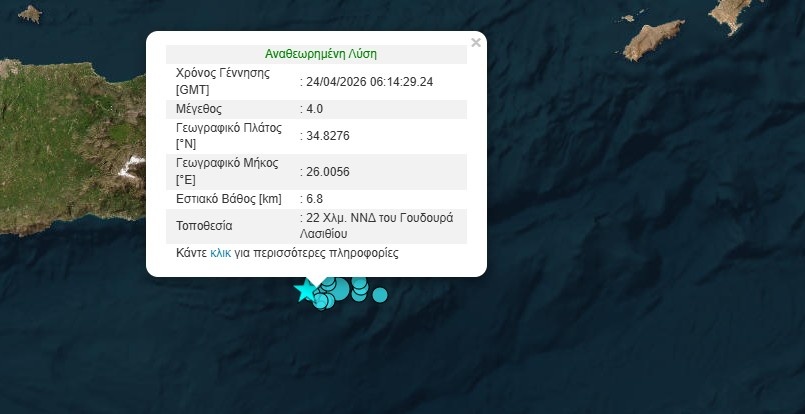 Δύο μετασεισμοί 4,2 και 4 Ρίχτερ σημειώθηκαν ανοιχτά του Λασιθίου, δοκιμάζοντας την υπομονή των κατοίκων του νησιού μετά την ισχυρή δόνηση των 5,7 Ρίχτερ.