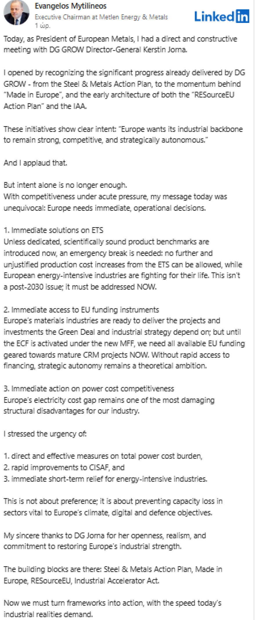 Νέα παρέμβαση πραγματοποίησε Ευάγγελος Μυτιληναίος ως πρόεδρος της European Metals, μετά τη συνάντηση με τη Γενική Διευθύντρια της DG GROW, Kerstin Jorna θέτοντας ευθέως μέσω ανάρτησης στο LinkedIn το ζήτημα της επιβίωσης της ευρωπαϊκής βιομηχανίας και ζητώντας άμεσες, επιχειρησιακές αποφάσεις από τις Βρυξέλλες για ενέργεια, χρηματοδότηση και ETS, εν μέσω οξυμένης πίεσης στην ανταγωνιστικότητα.
