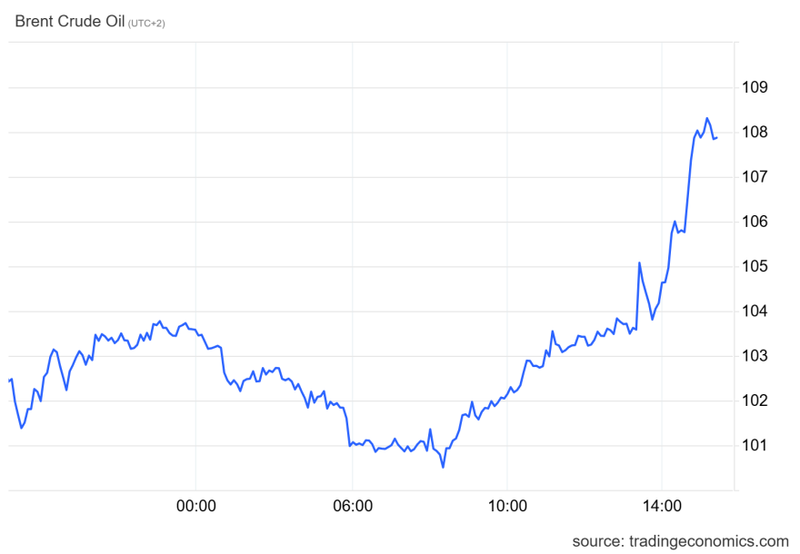 Το Brent, το βασικό σημείο αναφοράς για το αργό πετρέλαιο, ενισχύθηκε κατά περισσότερο από 4,5%, προσεγγίζοντας τα 108 δολάρια ανά βαρέλι, γεγονός που αποτυπώνει τη γενικευμένη ανησυχία των αγορών για την ενεργειακή ασφάλεια.