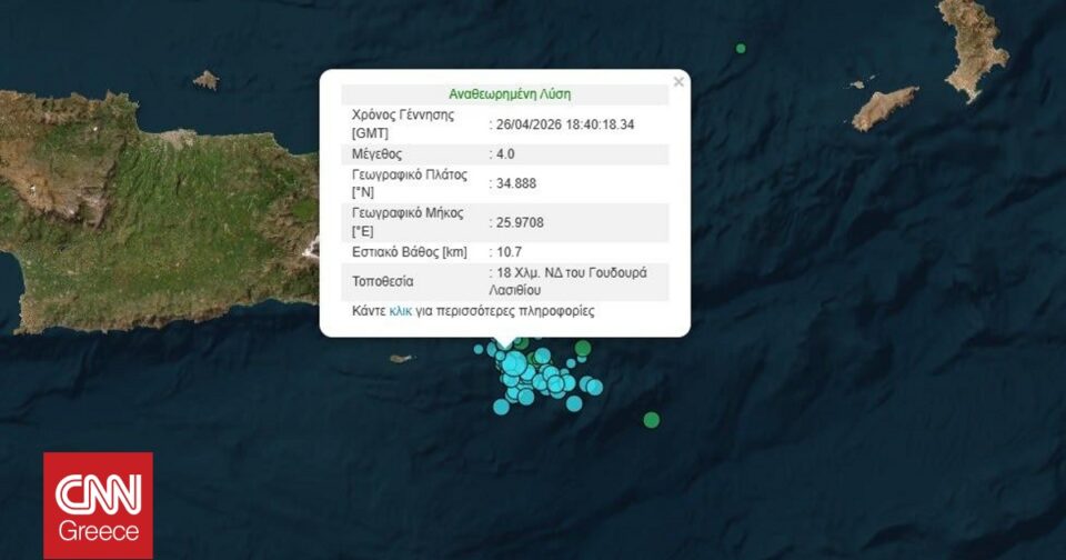 Συνεχίζεται η σεισμική δραστηριότητα στην Κρήτη, καθώς το βράδυ της Κυριακής (26/4) σημειώθηκε σεισμός μεγέθους 4 Ρίχτερ στα ανοιχτά του Λασιθίου.