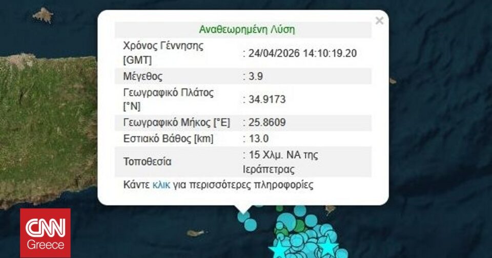 Ο σεισμός είχε εστιακό βάθος στα 13χλμ και σημειώθηκε στα 15χλμ νοτιοανατολικά της Ιεράπετρας.