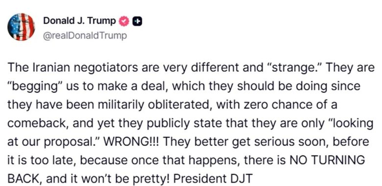 Στο ίδιο μήκος κύματος κινήθηκε και σε νεότερη ανάρτησή του, στην οποία ο Τραμπ αναφέρθηκε απευθείας στις διαπραγματεύσεις με το Ιράν, χρησιμοποιώντας ιδιαίτερα σκληρή γλώσσα για τους Ιρανούς διαπραγματευτές. Συγκεκριμένα, έγραψε: «Οι Ιρανοί διαπραγματευτές είναι πολύ διαφορετικοί και “παράξενοι”. Μας “ικετεύουν” να κάνουμε μια συμφωνία, κάτι που θα έπρεπε να κάνουν αφού έχουν συντριβεί στρατιωτικά, χωρίς καμία πιθανότητα επιστροφής, και παρ’ όλα αυτά δηλώνουν δημόσια ότι απλώς “εξετάζουν την πρότασή μας”. ΛΑΘΟΣ!!! Καλύτερα να σοβαρευτούν σύντομα, πριν να είναι πολύ αργά, γιατί όταν συμβεί αυτό, ΔΕΝ ΥΠΑΡΧΕΙ ΕΠΙΣΤΡΟΦΗ και δεν θα είναι καθόλου όμορφο!».