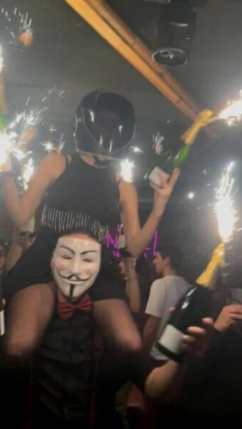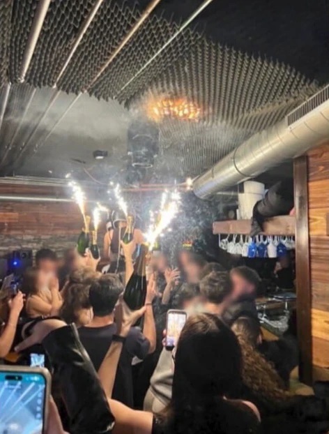 Στις φωτογραφίες φαίνονται αρκετά μπουκάλια σαμπάνιας με πυροτεχνήματα να υψώνονται στον αέρα, ενώ φαίνεται πως, όπως ανέφεραν μαρτυρίες, η φωτιά ξεκίνησε από την οροφή και μετά εξαπλώθηκε γρήγορα.