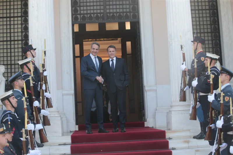 Στο Μέγαρο Μαξίμου βρίσκεται ο Γάλλος πρόεδρος Εμανουέλ Μακρόν, όπου τον υποδέχθηκε ο πρωθυπουργός Κυριάκος Μητσοτάκης για να ξεκινήσει η μεταξύ τους συνάντηση στο πλαίσιο της οποίας αναμένεται να υπογραφεί η ανανέωση της συμφωνίας αμυντικής συνεργασίας των δύο χωρών. Προηγήθηκε η επίσκεψη στη φρεγάτα «Κίμων», στο λιμάνι του Πειραιά.