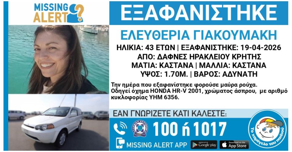 «Στις 19/04/2026, εξαφανίστηκε από τις Δαφνές Ηρακλείου Κρήτης, η Ελευθερία Γιακουμάκη, 43 ετών. Το «Χαμόγελο του Παιδιού» ενημερώθηκε στις 20/04/2026 για την εξαφάνιση της Ελευθερίας Γιακουμάκη και άμεσα προχώρησε στην δημοσιοποίηση των στοιχείων της ενήλικης, κατόπιν αιτήματος των οικείων της, καθώς πιθανώς συντρέχουν λόγοι οι οποίοι θέτουν τη ζωή της σε κίνδυνο.