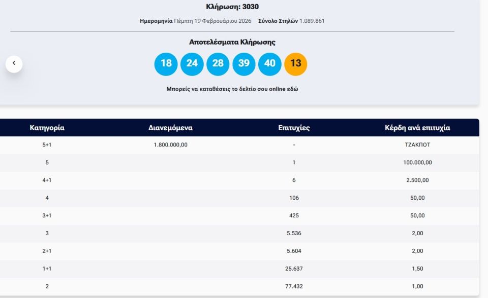 Πραγματοποιήθηκε το βράδυ της Πέμπτης (19/2) η κλήρωση 3030 του Τζόκερ που μοιράζει στην πρώτη κατηγορία τουλάχιστον 1.800.000 ευρώ.