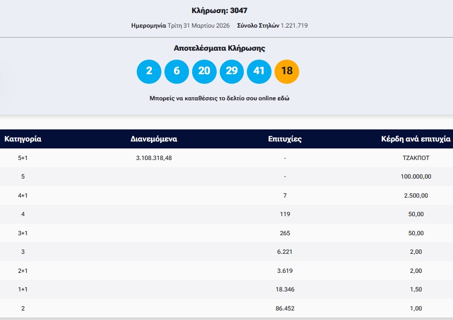Πραγματοποιήθηκε το βράδυ της Τρίτης (31/3) η κλήρωση 3047 του Τζόκερ που μοιράζει στην πρώτη κατηγορία 3.108.318,48  ευρώ.