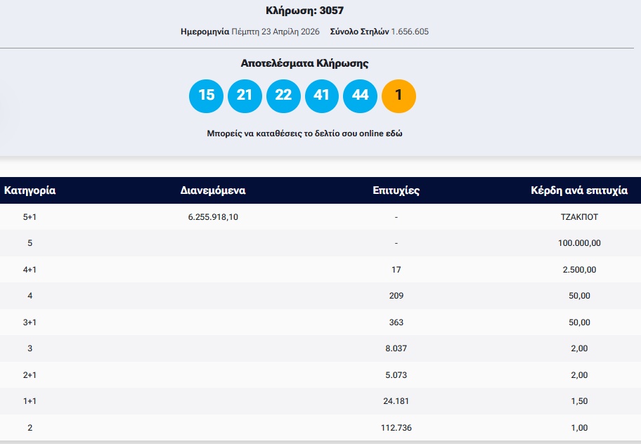 Πραγματοποιήθηκε το βράδυ της Πέμπτης (23/4) η κλήρωση 3057 του Τζόκερ που μοιράζει στην πρώτη κατηγορία πάνω από 6.255.918 εκατ. ευρώ.