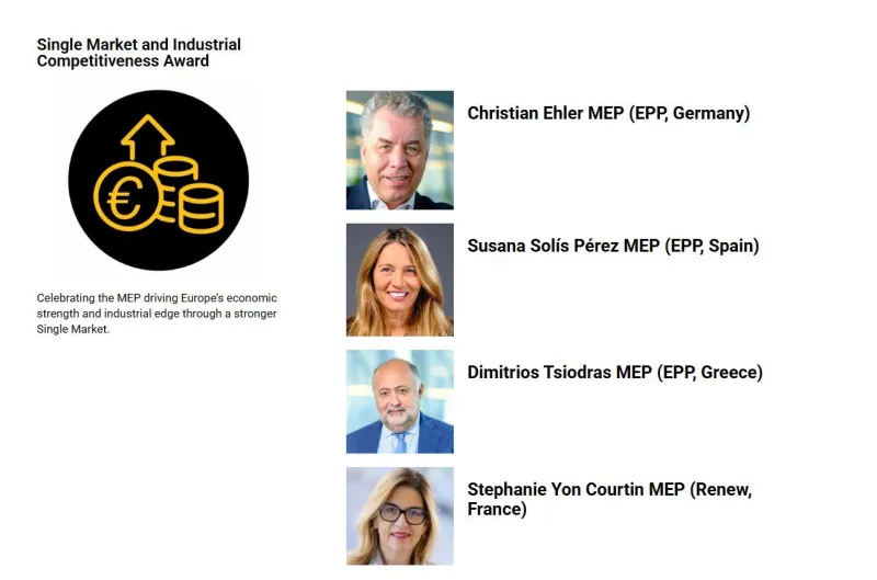 Η λίστα των συνολικά τεσσάρων υποψηφίων για το βραβείο είναι «αποτέλεσμα αυστηρής διαδικασίας μετά από πρόταση φορέων που σχετίζονται με το συγκεκριμένο αντικείμενο και με βασικό κριτήριο την κοινοβουλευτική συνεισφορά στην προώθηση της ολοκλήρωσης της ενιαίας αγοράς και την ενίσχυση της ευρωπαϊκής ανταγωνιστικότητας», σύμφωνα με σχετική ανακοίνωση.